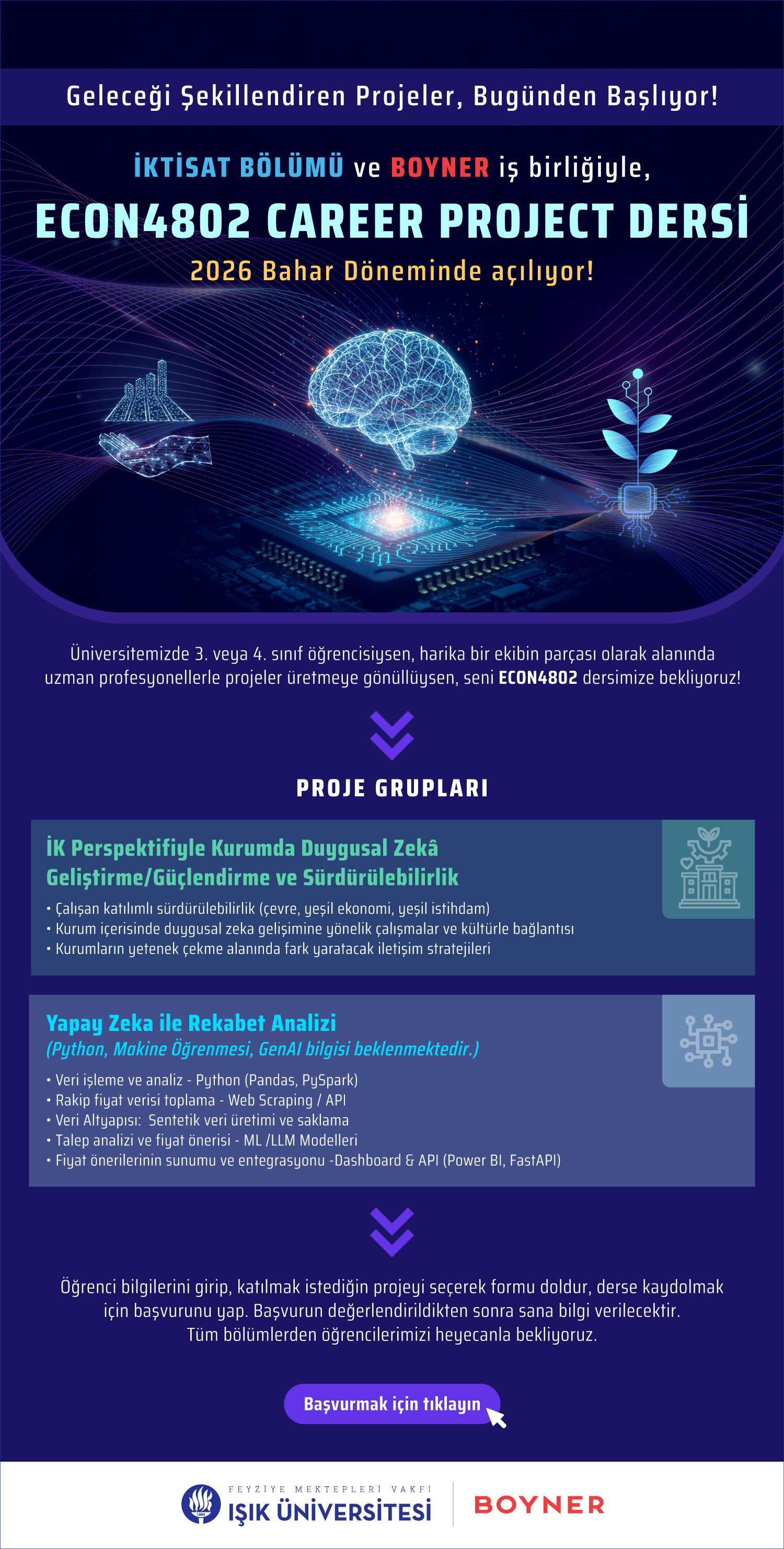 İktisat Bölümü ve Boyner Büyük Mağazacılık iş birliğiyle bir ilk! Tamamen proje temelli ECON4802 Special Topics in Economics: CAREER PROJECT dersi ile tüm bölümlerden 3. ve 4. sınıf öğrencilerimiz; 2026 Bahar Dönemi'nde de Boyner Holding'den deneyimli ekip liderleri eşliğinde gerçek hayattan projeler geliştirme fırsatı yakalayacak.