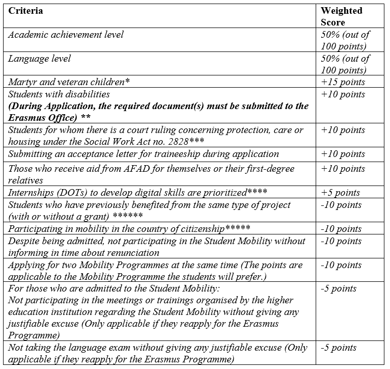 *According to the 21st Article of the Anti-Terror Law dated 12/4/1991 and numbered 3713, as well as the war veterans and their spouses and children, and the wives and children of the war martyrs, “public officials should not perform their duties while performing their duties at home and abroad or even if their titles have been removed. The spouses and children of those who were injured, became disabled, died, or killed due to terrorist acts and the coup attempt and the terrorist act carried out on 15 July 2016, pursuant to Article 7 of Decree-Law No. 667 of 23 July 2016, and The spouses and children of those who lost their lives due to the actions or the disabled civilians and their spouses and children are prioritized if they apply for Erasmus + student mobility.