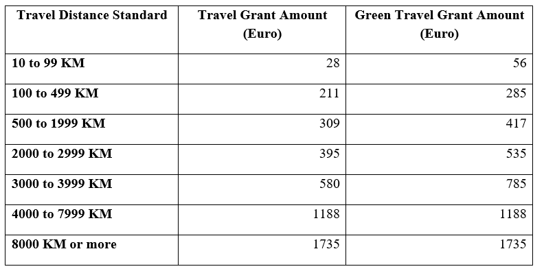 In order to contribute to students’ travel expenses, the distance in kilometers between the starting point of the mobility and the host location must be calculated using the distance calculator provided by the European Commission. The travel grant should then be determined based on the table below.