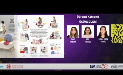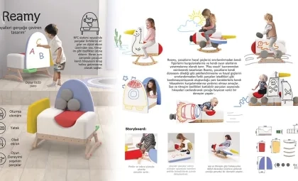 İzmir'de gerçekleştirilen ödül töreninde, Üniversitemizin Sanat, Tasarım ve Mimarlık Fakültesi Endüstriyel Tasarım Bölümü öğrencilerimiz Asu Yılmaz, Öykü Akkaya ve Fatma Doğa Bilgiç, "Reamy" çocuk koltuğu projesi ile üçüncülük ödülünü kazandılar. "Reamy" projesi, çocukların hayal güçlerini serbest bırakmalarını ve mobilya elemanlarını kendi tasarımları doğrultusunda şekillendirebilecekleri bir oyun alanı yaratmayı amaçlıyor. Bu tasarım, "Play Couch" teriminden ilham alarak, çocuklara oyun parkurları ve karakterler oluşturabilecekleri yaratıcı bir deneyim sunuyor. Bu yaratıcı ve işlevsel tasarım, çocukların oyun ve eğitim deneyimlerini geliştirmek için yenilikçi bir yaklaşım sunuyor.
